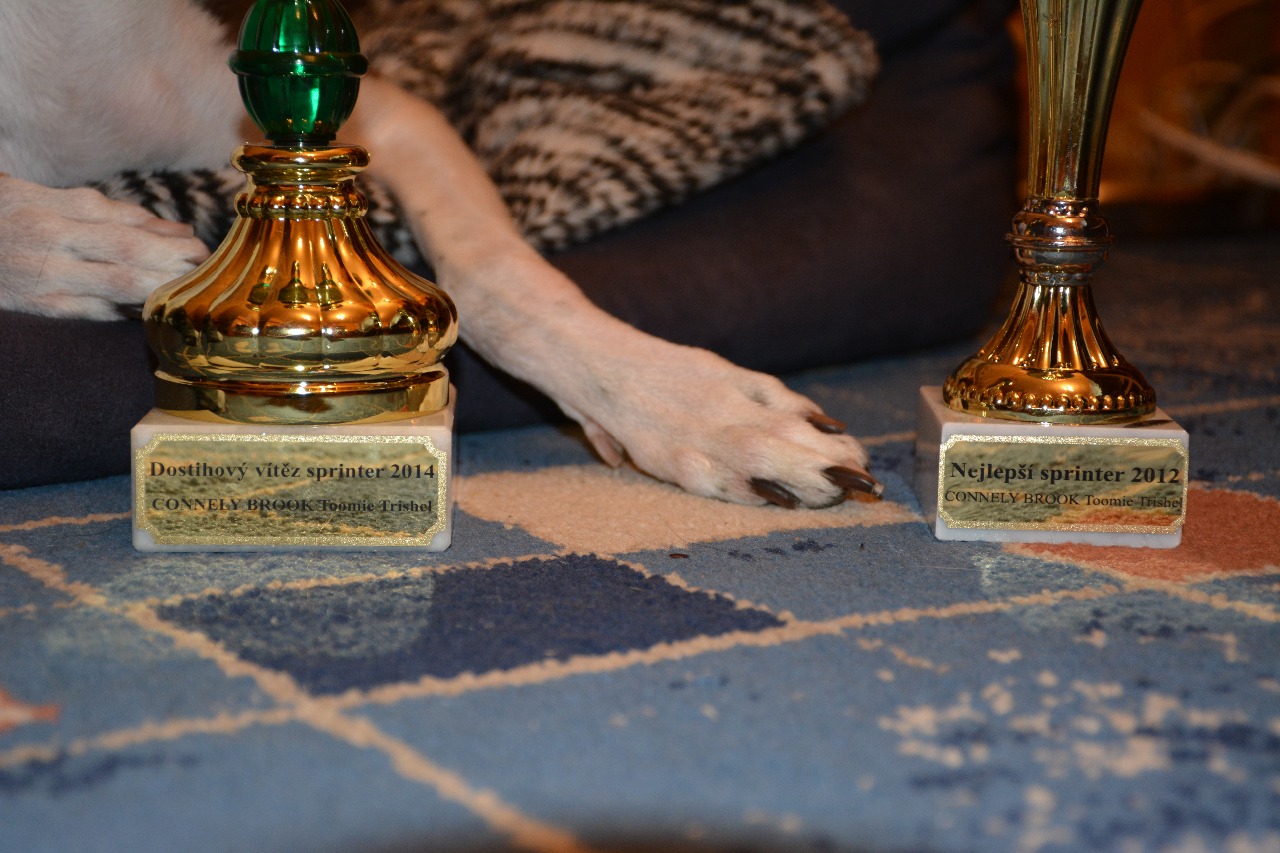Moc si vážíme Končiné úžasné sezóny 2014, kdy se po odchovu svých prvních štěňátek dostala neskutečně rychle do formy. Nejenže letos opět předváděla vyrovnané výkony, ale ve svých bezmála 5ti letech si vylepšila na 2 tratích i své osobní maximum. V Lednici to je pod 23 sec/360m. Za všechny letošní starty bych vzpoměla např. úžasný souboj s C Carinae a krásné 1. místo v Kolíně na dlouhé trati (480m), kdy pootvrdila mou domněnku, že máme doma " Sáblíkovou v psí podobě .-) Konča je prostě vytrvalkyně .-) a 360m jí nestačí .-)) Dále krásné 2. místo na mezinárodních dostizích Friendly Cup v německém Greppinu a v neposlední řadě nádherné zakončení letošní sezóny titulem viceMistryně Čech 2014 (2/11 mix sprinter - jako jediná fena v závodě). Díky dobré kondici a všestrannosti se letos jako bonus pro zpestření účastnila i několika corsingových a frisbee závodů. Zde bych vyzdvihla např. 1. místo a absolutního vítěze na Rejvíze a titul objev frisbee=nejlapší začátečník závodu. VIDEO ZDE. Skvělá práce Koný!! Jsi úúžasnáá!!