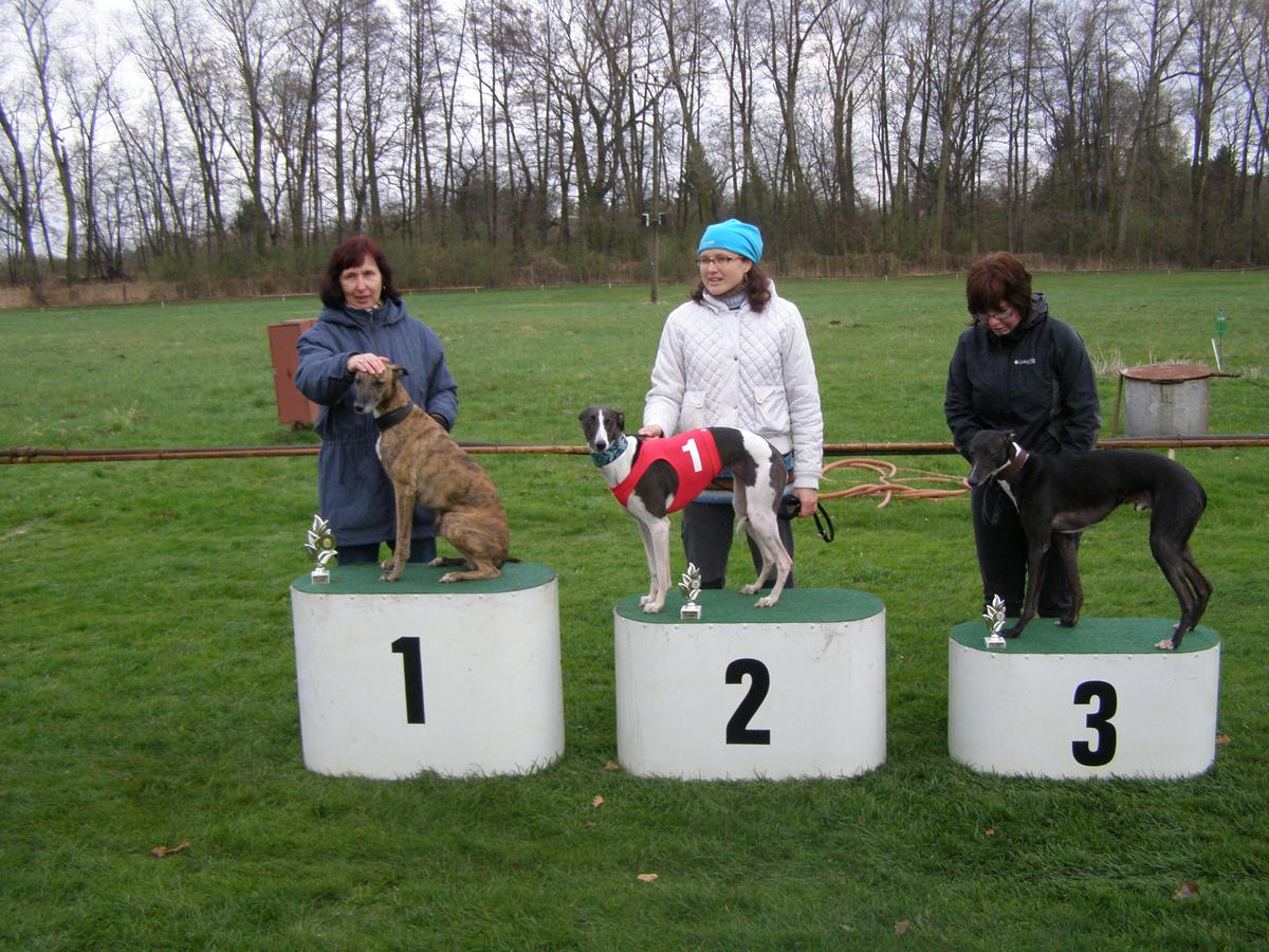 Na víkend před velikonoci (7.4.) byl naplánovaný 1. letošní dostih sezóny 2012 + 2. měření (poslední) naší Koný. Těšili jsme se na všechny známé a kamarády. Náš miláček měl taky na čase po zimě začít spalovat své navíc nasbírané kalorie. Apetit má výborný a jejím psím očím žádající večerní nášup nejde odolat. Zpět k dostihům. "Z mrtvých vstání "se na Bílou sobotu v našem případě nekonalo. Konča zůstala se svými 48,5 cm ve své původní kategorii. Kéž by se tak poctivě měřilo ve všech případech...Světýlko naděje pro sprintery svitlo v podobě "silné" účasti. Běžely se 2 rozběhy + finále A a B. Konča si nejrychlejším časem z rozběhu (23,6 - stejně jako jeden z našich psích favoritů Jenka van Arkadi) vyběhla červenou dečku č.1. Počasí nepřálo, chvilkama se díky dešti přerušovalo, ale finálové běhy i ve stížených podmínkách odsejpaly. Áčkové finále 6ti sprinterů bylo napínavé až do konce. Koňa, jak je u ní zvykem, urputně dotahovala ze 4.-5. místa po pomalejším startu. V poslední zatáčce, kdy byla třetí, zabojovala a bylo z toho (po shlédnutí cílových záběrů) o chlup (setina sekundy) 2. místo. Gratulujeme i 2. fence Aquilleře Teqamba za pěkné 4. místo. Holky jsou i mezi klukama výborné!